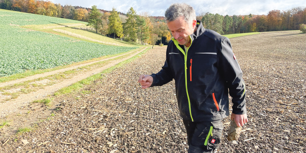 Trotzdem hat er gemischte Gefühle, wenn Menschen auf seinen Feldern nach Fossilien suchen. Vor allem dann, wenn der Acker frisch angesät ist. Für Laien ist oft nicht zu erkennen, dass der Boden bereits bestellt wurde. Doch das Saatgut liegt unter der Oberfläche, und die Steine wurden mit der Walze in den Boden gedrückt.